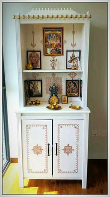 1) Нельзя помещать изображения или статуэтки Божеств прямо на полу. Для этой цели необходимо обзавестись специальным столиком или тумбочкой, которые должны быть накрыты куском ткани, платком или скатертью (белого, желтого или оранжевого цветов). В самой Индии для этих целей продаются специальные алтари, которые часто также имеют стеклянную дверцу.